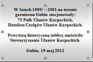 GORĄCY APEL. W miesiącu maju (19 maja, godz.11.00), odbędzie się w Gubinie długo oczekiwana i ważna dla wszystkich Ułanów Karpackich uroczystość. W rocznicę zwycięskiej bitwy o Monte Cassino, odsłonięta zostanie tablica pamiątkowa Ułanów Karpackich. Z uwagi na to, iż Konserwator Zabytków w Zielonej Górze nie wydał zgody na umieszczenie oryginalnej pułkowej Tablicy, zostanie odsłonięta nowa. Projekt graficzny – obok (uzgodniony przez Zarząd w porozumieniu z Tomaszem Skrzyńskim). Oryginalna płyta znajdzie się w miejscowym muzeum miejskim, u Pana Stefana Pilaczyńskiego.